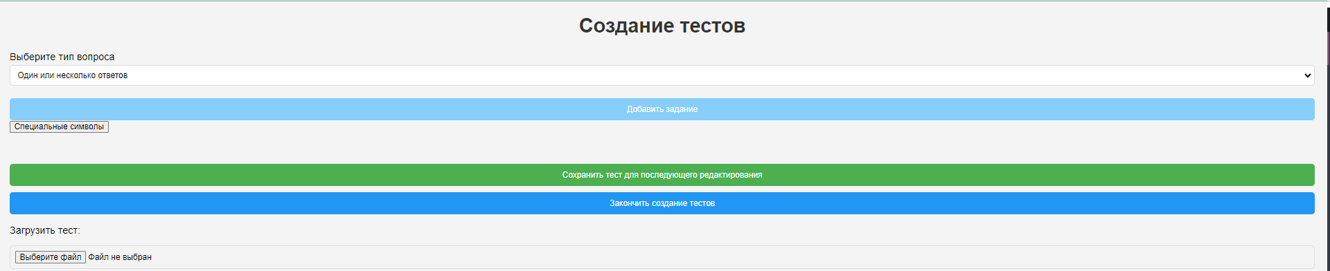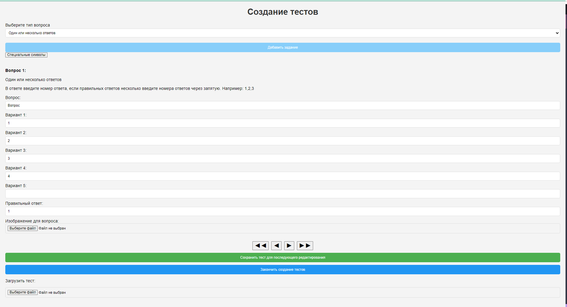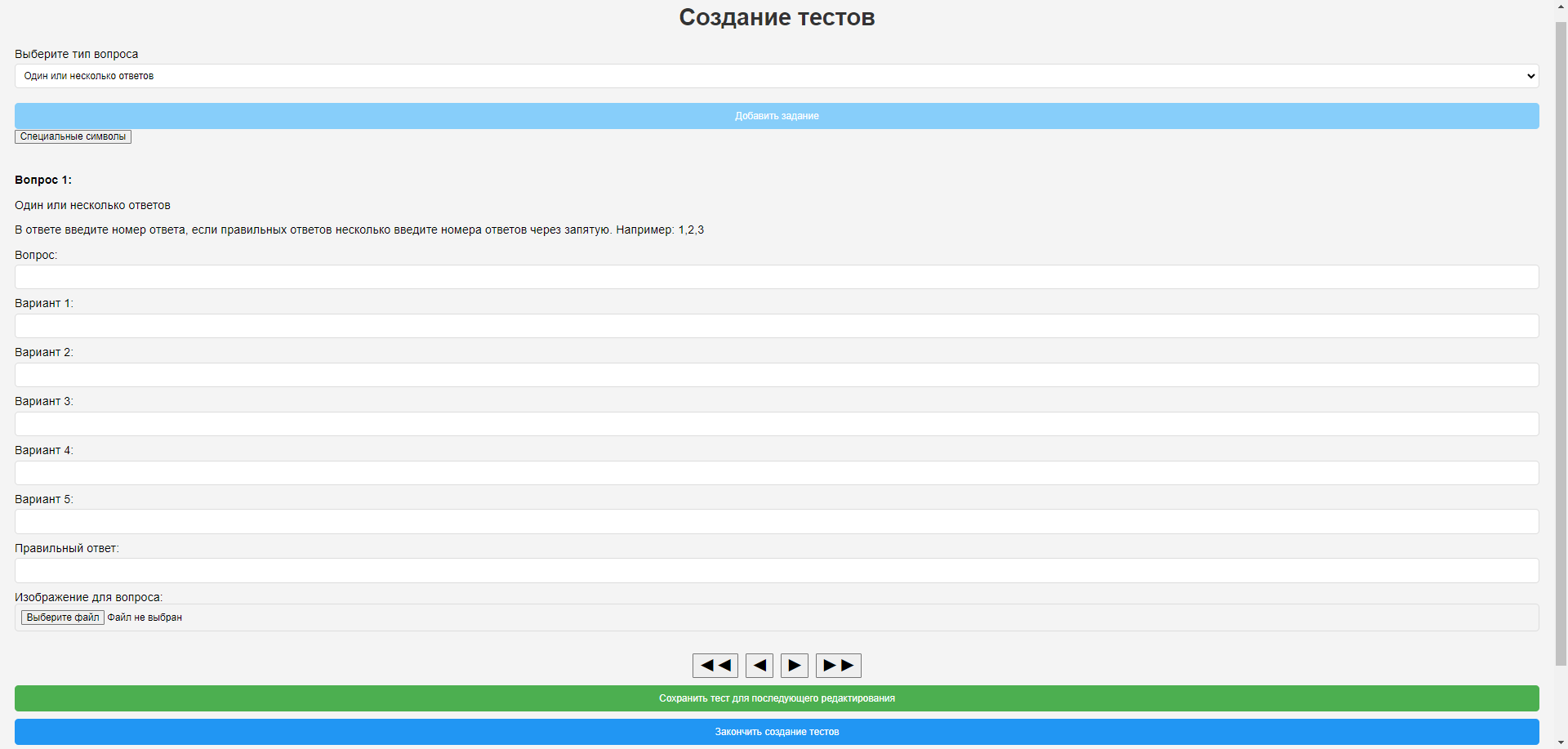 Для отправки итогового теста на сервер нажмите на кнопку "Закончить создание тестов"